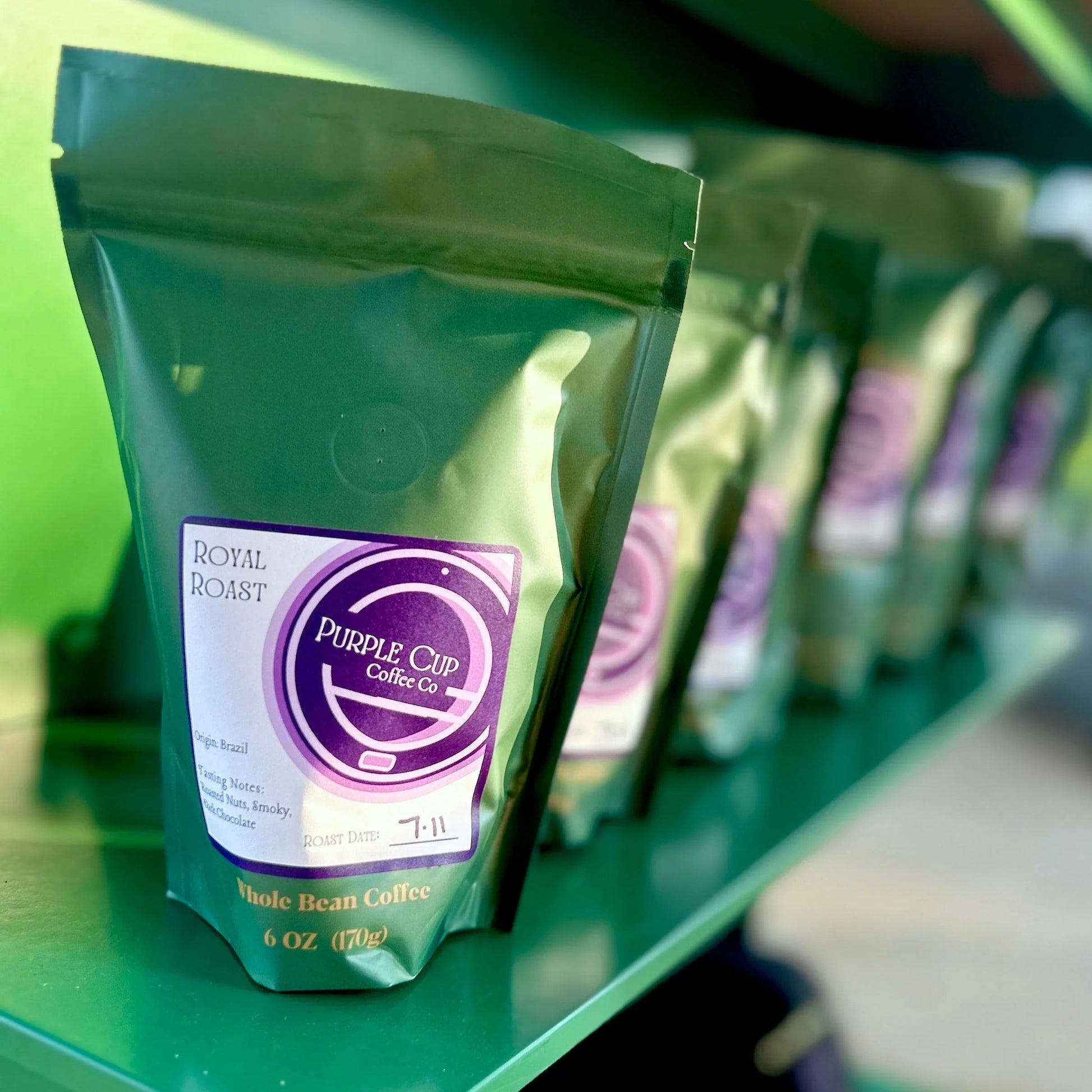 Our Purple Cup Royal Roast contains freshly roasted coffee beans from a Brazilian Origin with flavor notes consisting of dark chocolate, smoky, and roasted nuts.
